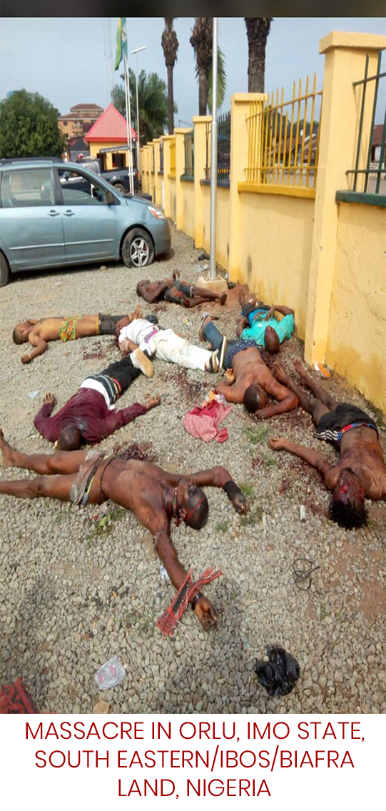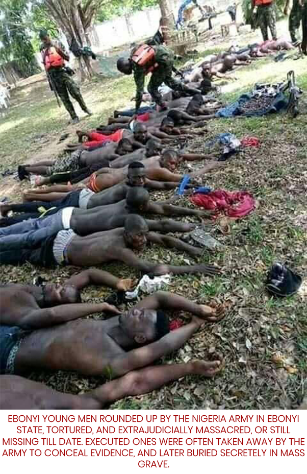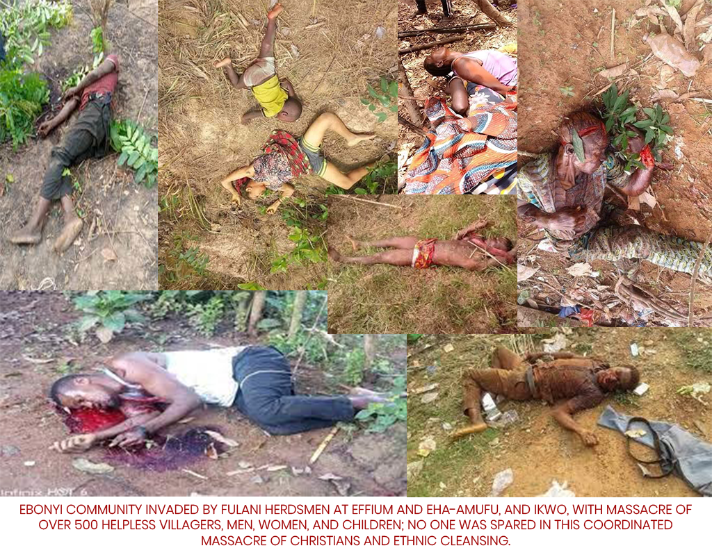 ON NOVEMBER 2022, THE SAME SECURITY FORCES, SOLDIERS, POLICE, FULANI HERDSMEN, AND OTHER FORCES SURROUNDED THE ENTIRE COMMUNITY OF EHAMUFU IN ENUGU/EBONYI STATES NIGERIA, AND INVADED THE SAME COMMUNITY IN THE MIDDLE OF THE NIGHT, WHILE EVERYBODY WAS SLEEPING AND MASSACRED MORE THAN 500 MEN, WOMEN, PREGNANT WOMEN, CHILDREN AND LITTLE GIRLS IN THE NAME OF ETHNIC CLEANSING, YET THE UNITED NATION (UN) CONTINUED TO BE KEEPING SILENT. CHILDREN WERE DECIMATED, IN THIS HORRENDOUS CRIMES/GENOCIDES AGAINST HUMANITY.